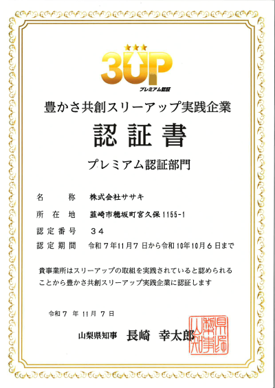 2025年11月7日付で、当社は、山梨県「豊かさ共創スリーアップ実践企業」の『プレミアム認証部門』に認証されました。
