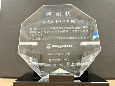 ササキは、取引先品質改善活動への取り組みが評価され、感謝状をいただきました。